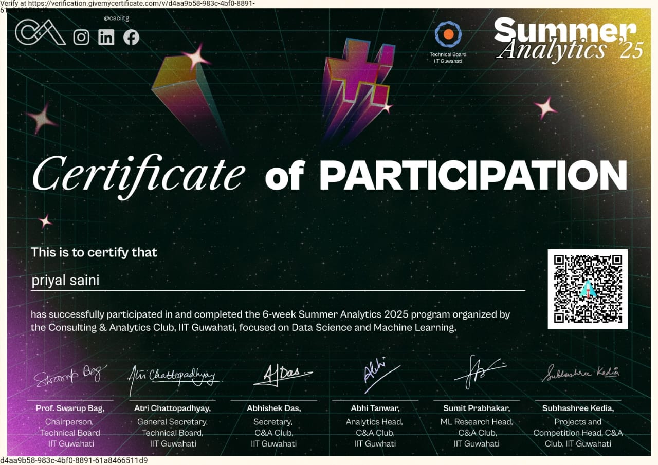 I gained practical exposure to data handling, model building, and analytics. I Enjoy turning raw data into meaningful insights and continuously work to improve my analytical and technical skills to grow as a Data Analyst and future Data Scientist.